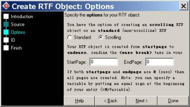 3.點擊next>按鈕到下一步,出現options對話框。當rtf文檔很大時,選擇scrolling單選按鈕,文檔在展示窗口中帶上垂直滾動條,選 standard則沒有滾動條;通過在startpage和endpage本文框中輸入頁碼數(或存儲有頁碼數值的變量)可使創建的rtf對象只包含文檔中的某些頁,默認值為0,即顯示文檔中的所有內容。如圖3所示。