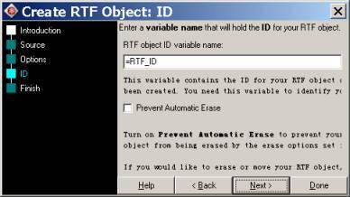 4.點擊next>按鈕到下一步,出現id對話框。在rtf object id variable name文本框中輸入存儲文件id值的變量名,系統默認的變量名為rtf_id;勾選prevent automatic erase復選框,可使rtf對象不會因其他圖標中相關設置而自動擦除。如圖4所示。