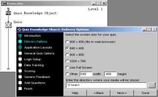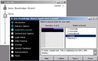 知識對象quiz默認的第一步為該知識對象的文字介紹,單擊按鈕“next”進入下一步“delivery options”(如圖2),這一步主要是設置作品的演示屏幕大小及音樂。例如屏幕大小選擇“640 x 480”,音樂文件夾您可根據實際需要選擇,考慮到減少網絡流量,這里我們不予理會,即不采用任何音樂。選擇確定后,單擊按鈕“next”進入下一步“application layouts”。