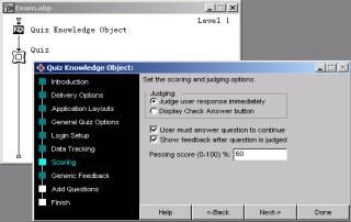 “scoring”這一步是關于練習答題分數的一些選項,如圖5所示。勾擇“judge user response immediately”、“user must answer question to continue”、“show feedback after question is judged”選項,在“passing score(0-100)%”域里輸入60,即如果總分為100,則60分為及格線。確定后單擊按鈕“next”進入下一步“generic feedback”。