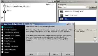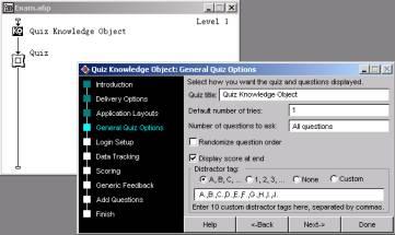 啟動authorware 6.5,新建一個“exam.a6p”文件。快捷鍵ctrl+shift+k調出知識對象瀏覽窗口,點擊“category”下拉菜單選擇“new file”類,雙擊知識對象“quiz”,程序自動在流程線上添加quiz知識對象圖標內容,并啟動進入quiz知識對象的設置對話框,如圖1所示。