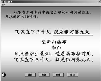 給出一句古詩和三個選擇項,要求在選擇項中找出與其配對的一句古詩,然后將它拖到原詩句后面,如果正確則顯示這首古詩的全部內容,并伴有本詩的朗讀配音;如果錯誤則拖動的詩句將返回原處并顯示出錯提示。每道題目限時10秒鐘,超過10秒就提醒超時并切換到下一題。朗讀古詩時可以進行控制。
