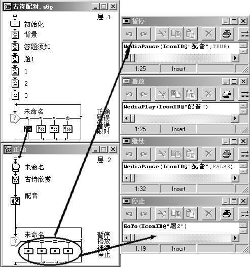 本例利用了目標區、按鈕、時間限制這幾個交互實現古詩句的“對對碰”(配對)效果,在authorware中若能合理利用其強大的交互功能,定能制作出更好的互動課件來。
