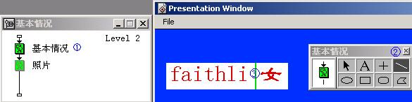 presentation windon,同時工具箱窗口'基本情況'也顯示在界面上,用鼠標點擊工具箱中大寫的a,展示窗口出現文本輸入符號指針,你就可以輸入你的基本情況了,例如,姓名:faithli;性別:女;其它等等,見圖。。。