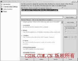 2.完成override global settingse項(xiàng)中的設(shè)置后,單擊next按鈕進(jìn)入設(shè)置問(wèn)題項(xiàng)(如圖3),圖 3是向?qū)У哪J(rèn)設(shè)置,我們根據(jù)需要修改題目中的內(nèi)容、候選答案、判斷結(jié)果。首先在preview windows窗口中 選取“sample question:which of the following cities are in australia?”,這時(shí)“sample question :which of the following cities are in australia?”會(huì)出現(xiàn)在edit window編輯窗口,我們?cè)谶@里輸入“ 下列小說(shuō)哪些不是魯迅的作品?”,完成題目的修改。接著在preview windows窗口選取“perth ”(這是正確 的答案選項(xiàng)),在編輯窗口將“perth ”修改為“《家》”,此時(shí)就修改完一個(gè)候選答案,同樣我們完成其余 的修改工作,這樣問(wèn)題和答案就已修改完成。單擊next按鈕進(jìn)入完成項(xiàng),保存所有設(shè)置,退出向?qū)А?