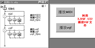 這程序的主流程圖見圖25所示。這程序播放操作很簡單,有個缺陷,就是當midi或vqf文件播放完畢后,按鈕沒有變化,這是由于ucd的不足,沒有對播放次數和時間做處理,當然,你只要知道播放文件的長度,就可以在播放按鈕下面加一個等待圖標,設定好時間,再在下面加一個計算圖標,將變量midi或vqf改變一下就可以了。