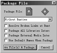 background color(背景色) 指定展示窗口的背景顏色,單擊文字前的色 塊,可改變顏色,缺省值為白色。本實(shí)例保持缺省值。 chroma key(關(guān)鍵色) 當(dāng)使用視頻重疊卡,而且該卡支持chroma色鍵時(shí)可設(shè) 置,單擊文字前的色塊,可改變顏色,缺省值為洋紅色。本實(shí)例保持缺省值。 size 下拉列表框 用來設(shè)置展示窗口的大小,缺省值為640×480。共有多種方式: variable(任意大?。嚎扇我庠O(shè)置展示窗口的大小,且在運(yùn)行中可改變展示窗口的大小。 512×342~1152×870:這些選項(xiàng)用來設(shè)置固定大小的展示窗口,以象素為單位。 use full screen(使用全屏):使展示窗口自動(dòng)占據(jù)整個(gè)屏幕。本實(shí)例選擇“variable”,實(shí)際常使用缺省值。 center on screen(屏幕中央)復(fù)選框 選中,展示窗口將顯示在屏幕的中央。缺省值為不選中。本實(shí)例為選中。 title bar(標(biāo)題欄)復(fù)選框 選中顯示展示窗口的標(biāo)題欄,不選中,隱藏標(biāo)題欄。缺省值為選中。本實(shí)例保持缺省值。 menu bar(菜單欄)復(fù)選框 選中顯示展示窗口的菜單欄。缺省值為選中。本實(shí)例為未選中。 task bar(任務(wù)欄)復(fù)選框 決定當(dāng)windows 9x的任務(wù)欄覆蓋部分展示窗口時(shí),是 否顯示該任務(wù)欄,選中顯示任務(wù)欄,缺省值為不選中。本實(shí)例保持缺省值。 其余選項(xiàng)一般保持缺省值,這里不再作介紹。 5.3.2 文件打包 選擇“文件”(file)菜單下“打包”(package)命令,顯示打包對(duì)話框。各選項(xiàng)含義如下: