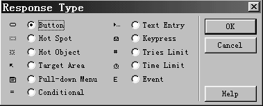 本例制作過程如下: 1.運(yùn)行authorware ,新建一文件。 2.從圖標(biāo)工具欄向程序設(shè)計(jì)窗口中的主流程線上拖入一個(gè)“顯示圖標(biāo)” ,并命名為“主菜單”。 3.從圖標(biāo)工具欄向主流程線上拖入一個(gè) “交互圖標(biāo)”,并命名為“選擇”。 4.從圖標(biāo)工具欄向程序設(shè)計(jì)窗口中“選擇” 圖標(biāo)的右方拖入一個(gè) “群組圖標(biāo)”,此時(shí)彈出“響應(yīng)類型”對(duì)話框,如下圖,這里有11種用戶交互和響應(yīng)方式可供選擇,在此我們選擇“按鈕類型”(button),點(diǎn)擊“ok”后,將該圖標(biāo)命名為“按鈕一”。