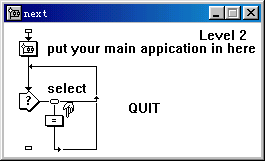 7、群組(group)圖標(biāo)“next”中為主程序內(nèi)容,你可以將你的程序放在這個圖標(biāo)內(nèi)。計算(caculation)圖標(biāo)“quit”是一個按鈕,其中代碼為 “goto(iconid@"end")”,意思就是在點(diǎn)按此按鈕后,程序轉(zhuǎn)到“end”圖標(biāo)執(zhí)行。