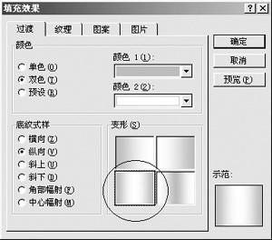 2、水波的準備:您可以使用office系列中的powerpoint來制作。新建一個空白的幻燈片,用繪圖工具欄中的矩形工具繪制一個矩形,其高度要略少于您的文字圖片的高度。選中這個矩形,使用繪圖工具欄中的線條顏色工具,設置其為無線條色,點擊填充效果工具,在打開的“填充效果”對話框的“過渡”標簽中,將顏色設置為雙色,顏色1選擇為灰色,顏色2選擇為白色,底紋式樣選擇為縱向,并選擇左下角的變形式樣(如圖2)。