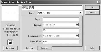 4、在流程線上再加一個運動圖標。先雙擊打開“水波”顯示圖標的演示窗口,然后關閉。再雙擊運動圖標打開其屬性對話框,這樣,“水波”顯示圖標的演示窗口就會同時被打開。用鼠標先單擊一下水波圖片,然后,將“type”選擇為“path to end”,在“timing”下方的輸入框中輸入“15”(這個數字可以根據效果進行調整),并在“move when”的輸入框中輸入“x=0”(在英文狀態下輸入),如圖4所示。盡可能地水平拖動水波圖片,使其左端盡可能與文字圖片的左端對齊。