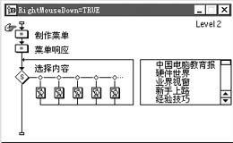 當用戶在演示窗口單擊鼠標右鍵時出現一個菜單(類似于在windows桌面上單擊鼠標右鍵出現的菜單)。菜單中的第一重是《中國電腦教育報》的幾個一級欄目,如:硬件世界、軟件天地、網絡時代和電腦教育(注:目前軟件天地與網絡時代已合為軟件.net,電腦教育應為教育信息化);第二重菜單是軟件天地的一些二級欄目,如:業界視窗、新手上路和編程樂園等。當用戶選擇某個菜單時,將跳轉到相應的內容。