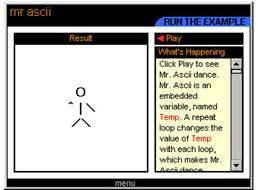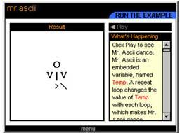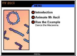 畫面上有一個由線段和字母等符號組成的模擬小人,這就是ascii先生。畫面右側有一個【play】按鈕,單擊【play】按鈕,畫面左側組成模擬小人的線段和字母不斷變化,從而產生ascii先生翩翩起舞的效果,如圖16-4所示是其中的一個畫面。