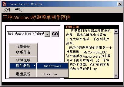 有了上面這些擴(kuò)展函數(shù)就可以很輕松的搞定下拉列表菜單和鼠標(biāo)右鍵彈出式菜單,而pull-down menu下拉式菜單在authorware系統(tǒng)就提供了。