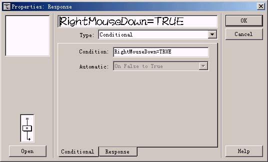 (2)加鼠標(biāo)右鍵響應(yīng)彈出菜單的永久條件交互和下拉列表菜單選擇菜單的按鈕響應(yīng)。設(shè)置條件“rightmousedown=true”,其中“rightmousedown”為系統(tǒng)變量,返回類型為“continue”,并設(shè)置為永久交互,如圖5.6所示。這樣當(dāng)用戶進(jìn)行鼠標(biāo)右漿操作時(shí),條件為真,執(zhí)行計(jì)算圖標(biāo)里的代碼后并彈出菜單,由用戶選擇: