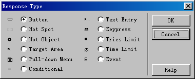 8、雙擊“answer”圖標(biāo)上面的小矩形按鈕,打開響應(yīng)屬性設(shè)置對話框。在“type”下拉列表中,將其響應(yīng)類型改為“熱區(qū)(hot spot)”。然后發(fā)現(xiàn)“answer”圖標(biāo)上面的小矩形按鈕變成了虛線框矩形。這時(shí)可見設(shè)計(jì)窗口中出現(xiàn)熱區(qū)位置,將其拖拽并調(diào)整大小和位置如圖。