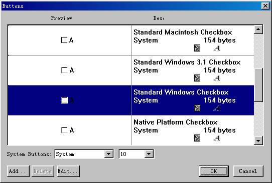 單擊“buttons...”按 ,可對按鈕類型進(jìn)行詳細(xì)的設(shè)置,比如設(shè)置按鈕的風(fēng)格、形狀、文字字體等,還可以定義自己的圖形按鈕。本例我們選用“standard windows checkbox”類型的按鈕。