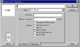 (1)用鼠標單擊【properties:response】對話框下方的【text entry】按鈕,彈出圖2-11所示【text entry】對話框來設置最終用戶的輸入控制。在對話框中用鼠標單擊【extra words】選項前的單選框,請讀者在選擇該選項的時候,注意流程線上程序邏輯流程的變化。
