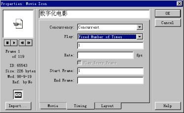 ⑤【use movie palette】使用數字化電影的調色板: 選擇該選項,authorware將使用數字化電影本身的調色板,而不再使用authorware的調色板,請讀者注意,并非所有的數字化電影都使用該選項。對于有的電影格式,該選項變為灰色不可用。