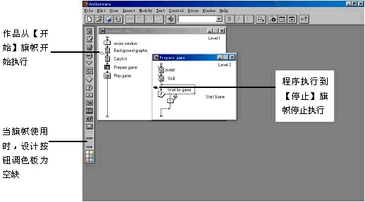 (2) 用鼠標單擊設(shè)計按鈕調(diào)色板上旗幟位置的空缺處,旗幟會自動從設(shè)計窗口流程線上取消。
