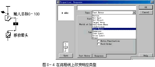 只需用鼠標雙擊流程線上的響應(yīng)類型圖標,彈出圖8-4所示的響應(yīng)分支屬性對話框,在該對話框中可以設(shè)置響應(yīng)的類型等多種選項和設(shè)置。然后單擊【ok】命令按鈕結(jié)束對該分支結(jié)構(gòu)的設(shè)置。使用【control】菜單的【play】命令繼續(xù)執(zhí)行應(yīng)用程序。