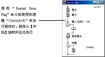 (3) 如果希望程序從【開始】旗幟所在位置執(zhí)行,使用【control】菜單中的【restart from flag】命令(快捷鍵為ctrl+alt+r),否則使用【control】菜單中的【restart】命令(快捷鍵為ctrl+r)。來運行程序