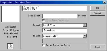 該【判定】分支結構使用【判定】設計按鈕對響應的匹配和控制實現了特定的功能。【判定】設計按鈕并不僅僅使用來創建執行任務的判定分支結構,還可以用來實現特殊的任務,在該實例中,我們使用【判定】分支結構來實現:當鼠標按下的情況下,authorware循環執行該判定分支中的空操作,也就是說,當最終用戶一旦按住鼠標的話,authorware一直進行空操作。只有當鼠標左鍵松開后才開始執行下面的設計按鈕中的內容。