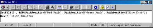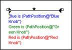 rgb函數——其作用是將紅、綠和藍3種色彩值合成一種顏色,本例中的紅、綠和藍的值分別由pathposition @"red knob"、pathposition @"green knob"和pathposition @"blue knob"決定,即用3個滑塊在標尺上的位置確定r、g、b的值。
