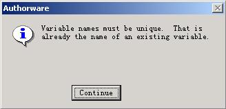 自定義變量是用戶根據(jù)程序設(shè)計(jì)與執(zhí)行的需求而自己添加定義的變量。在authorware 6.5中可以通過(guò)調(diào)出變量分類窗口(執(zhí)行菜單【window】/【variables】或快捷鍵ctrl+shift+v)后選擇【new】按鈕進(jìn)行新建自定義變量操作,如圖2所示;亦可在任何的變量使用場(chǎng)合下直接定義變量,如計(jì)算圖標(biāo)代碼編輯器里,確定后系統(tǒng)會(huì)自動(dòng)判斷該變量為何類型變量,如果為用戶自定義則提示新建之。變量名通常用英文字母+數(shù)字來(lái)表示,但是不可以出現(xiàn)和系統(tǒng)變量或已有自定義變量同名的情況,即要保證變量名表示的唯一性,否則會(huì)出現(xiàn)錯(cuò)誤提示,如圖3所示。