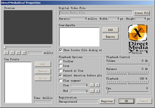 xtras在authorware 6.5中的使用一般視其功能而言,例如提供轉場過渡效果的xtras一般在顯示圖標、交互圖標等的【transition】屬性域里出現;有的xtras提供相關的控制函數,可以在function函數列表對話框里查找到;也有的xtras提供了可視化的設置界面,例如directmedia xtra,安裝后在菜單【insert】里多了一個【tabuleiro xtras】|【directmediaxtras】的菜單選項,如圖7所示;單擊選擇后,此時在程序流程就自動插入一個sprite圖標"directmediaxtra",同時進入它的設置界面,如圖8所示。最后還需要提醒一下,使用了外部擴展的xtras,在程序打包發行時也必須一起附帶上,拷貝到打包文件的【xtras】目錄下即可。
