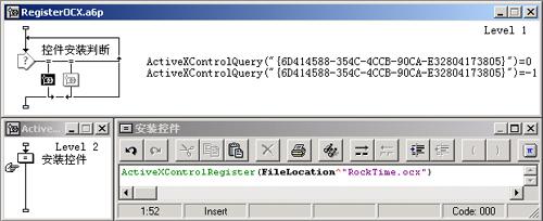 假如在客戶機器上發現沒有安裝相應版本的activex控件,那么可以用系統函數activexcontrolregister()進行注冊,例如注冊當前文件目錄下的rocktime.ocx控件為例,其代碼為: