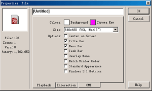 選擇modify-file-properties命令來設定authorware文件的屬性,出現如圖所示的文件屬性設定對話框。該屬性設定對話框是設定authorware最終演示產品的屬性,如演示窗口的標題、演示窗口的大小、演示窗口的背景顏色以及是否具有菜單欄和標題欄等外觀特性。 | ![]() |