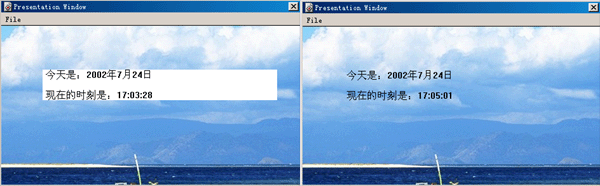 單擊工具欄中的運行按鈕,可以看到運行效果,但是,結果并不令人滿意:首先文字下有一塊白區域遮住背景,很不美觀;其次時間并不跳動。
