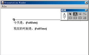 雙擊“背景”圖標,出現演示窗口和繪圖工具箱。單擊工具欄中的引入素材按鈕,讓該顯示圖標顯示一個圖片作為電子表的背景。 雙擊“時間”顯示圖標,選擇繪圖工具箱中的輸入文字工具,在出現的演示窗口中輸入如圖所示文字。 | ![]() |