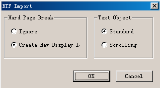 首先處理引入的文本對象中的換頁符,選擇ignore單選按鈕是忽略換頁符,將所有的文本當成一個對象放在一個顯示圖標中。選擇create new icon單選按鈕則為每頁建立一個新的顯示目標。然后選擇文本的顯示風格,是標準的文本顯示方式(選擇standard單選按鈕)還是帶有滾動條的文本顯示方式。如果文本較長,則選擇帶滾動條的文本(選擇scrolling單選按鈕)。 | ![]() |