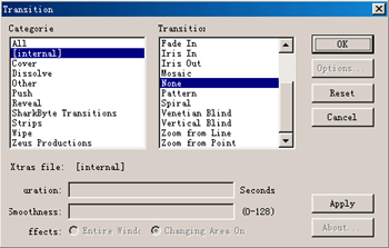 從categories列表框中選擇一種過渡類型,在transition列表框中選擇一種過渡方式。在duration文本框中設(shè)置過渡方式的持續(xù)時間,從0到30秒,在smoothness文本框中設(shè)走過渡方式平滑性,0為最光滑,數(shù)字越大越粗糙。