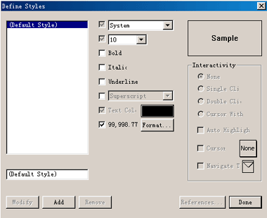 在文字編輯和處理中,需要對文字的字體、字號以及風格等一一設(shè)定,這樣操作很麻煩,authorware提供了一種自定義文字風格功能,它可以把自己喜歡的字體、字號及風格組合在一起形成一個新的文字風格。選擇text-define style命令,出現(xiàn)如圖對話框: 用戶可以在該對話框中增加、修改、刪除自己的文字風格,對于自定義的文字風格會如系統(tǒng)提供的風格一樣在工具欄的風格列表框中顯示出來。 | ![]() |