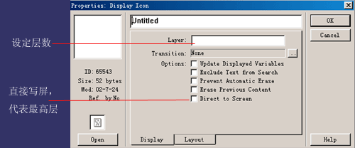 在layer文本框中輸入該顯示圖標的顯示層數(shù),層數(shù)越高,顯示的圖形就越在上方,它會遮住層數(shù)低的圖形。authorware中還可以設(shè)定圖片層數(shù)為最高層。選擇options選項組中的directto screen復選框,則這顯示圖標將具有最高層,它的圖形將顯示在其他所有顯示圖形之上。