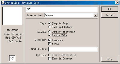 (4)設(shè)置搜索特性 選擇search immidately復(fù)選框,程序執(zhí)行此導(dǎo)航圖標(biāo)時(shí)將自動(dòng)直接搜索預(yù)設(shè)字符。選擇show incontext復(fù)選框,程序?qū)@示匹配對象的上下文。 導(dǎo)航圖標(biāo)設(shè)置為查找跳轉(zhuǎn)到指定頁功能后,程序運(yùn)行到此導(dǎo)航圖標(biāo)將彈出查找窗口。 在word/phrase文本輸入框中輸入一個(gè)單詞或短語關(guān)鍵詞,然后單擊find按鈕或按回車鍵,則authorware將開始搜索包含此關(guān)鍵詞的頁面.并將搜索到的頁面名稱顯示在page列表框中。用戶項(xiàng)查看某頁,只要用鼠標(biāo)雙擊列表框中的這頁標(biāo)題就可以直接進(jìn)入該頁;或者用鼠標(biāo)單擊該頁的標(biāo)題使其處于選中狀態(tài),然后單擊go to page按鈕也可以進(jìn)入該頁。在查找到的頁面中,正文中所含的關(guān)鍵詞將以彩色高亮顯示出來。 程序運(yùn)行后所彈出的查找窗口上都顯示英文標(biāo)題,我們需要修改程序設(shè)置,將查找窗口顯示成中文標(biāo)題,這樣可以方便最終用戶對本軟件的使用,因?yàn)椴⒎撬械某绦蚴褂谜叨际煜び⑽模性诔绦蛑幸M量避免使用英文提示。而且此處使用英文界面與整個(gè)程序的風(fēng)格也不一致。修改查找窗口的標(biāo)題選擇modify-file-navigation setup命令,彈出導(dǎo)航設(shè)置對話框。 |  |