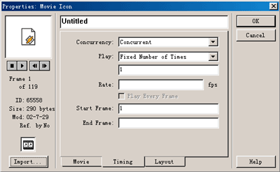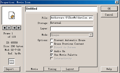 在authorware還可以播放數字電影文件,從anthorware圖標工具欄上拖動一個數字電影圖標到設計窗口的流程線上。雙擊該數字電影圖標,彈出數字電影圖標屬設置對話框,authorware同時在屬設置對話框后面打開演示窗口。 | ![]() |