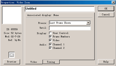 在freeze下拉列表框設定視頻播放結束后在屏幕上是否保留視頻畫面。它有三個選項: 選擇never。則在屏幕上將不保留任何圖像。 選擇last frame shown,將播放結束時的最后一幀圖像保留在屏幕上。 選擇end frame,在屏幕上保留根據設置的結束幀圖像,結束幀的設置是在視頻圖標設置對話框的timing選項卡中。 | ![]() |