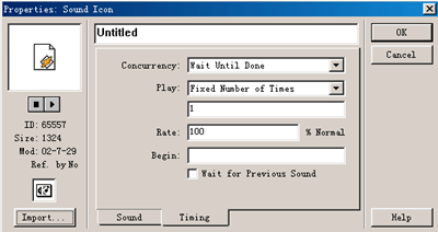 選擇wait for previous sound復選框,待以前聲音圖標中聲音播放完后再播放當前聲音。否則將終止以前聲音直接播放當前聲音圖標中的聲音文件。