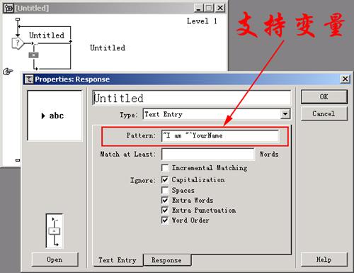 假如自定義變量yourname的值為rock,那么根據(jù)上述表達式,當用戶輸入字符串組"i am rock"的時候則產(chǎn)生分支響應(yīng)。另外,如果想使用多組字符或者字符詞組來匹配此響應(yīng),那么在這些字符之間可以用"|"符號分隔開,例如在【pattern】文本框內(nèi)輸入:"true|false",則程序運行時,輸入true或false都會產(chǎn)生分支響應(yīng)。