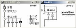 雙擊“移動窗口”圖標,在其中放置一個“交互”圖標,命名為“move window”。在此交互圖標右側放置一個“計算”圖標和一個群組圖標,響應類型都為“條件響應”,響應條件分別為mousedown和~mousedown。設置mousedown圖標分支的屬性,“自動”為“為真”,“分支”為“重試”。設置~ mousedown圖標分支的屬性,“自動”為“為真”,“分支”為“退出交互”。