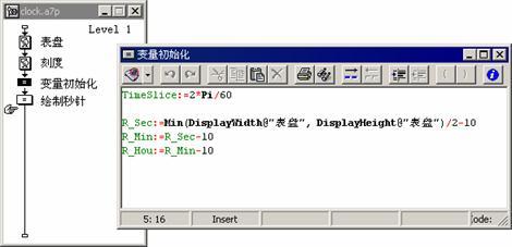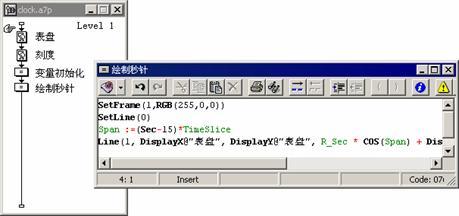 表示秒針轉動一次的弧度是2*pi/60,這是因為秒針轉動一周(經過2*pi弧度)需要擺動60次。表達式displaywidth@"表盤"和displayheight@"表盤"分別計算出表盤的高度和寬度,程序語句: