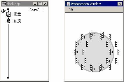 向流程線上“表盤”設計圖標之后的位置拖放一個【顯示】設計圖標,將其命名為“刻度”,然后在“刻度”設計圖標中創建一系列代表時間刻度值的文本對象:從1到12。為了將時間刻度同上一步驟中創建的表盤對齊,可以在按下shift鍵的同時依次雙擊“表盤”設計圖標和“刻度”設計圖標,此時兩個設計圖標中的所有顯示對象都出現在【演示】窗口中,如圖3-55所示。把所有文本對象擺放妥當之后,將它們組合成為一個顯示對象,這樣就使文本對象之間的相對位置不再發生變化。
