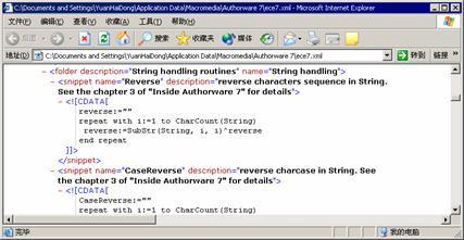 上述過程全部以代碼片段的形式保存在chapter03文件夾下的ece7.xml文件中。讀者可以打開該文件,如圖3-36所示,將其中的代碼片段復制到自己的ece7.xml文件中(它通常位于c:/documents and settings/<用戶名>/application data/macromedia /authorware 7路徑中)。讀者也可以直接使用光盤中的ece7.xml文件替換自己的ece7.xml文件,并取消文件的只讀屬性,在此之前請做好ece7.xml文件的備份工作,這樣在authorware 7.0中就可以通過插入代碼片段的方式使用這些過程,如圖3-37所示。在使用代碼片段時,需要創建在上述過程中以粗體表示的自定義變量。