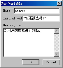 關閉“a”設計窗口,確認輸入后,彈出新變量定義對話框,設置如圖。“initial val”是初使值,“description”是對該變量進行說明,可以不寫。初使值設為“你還沒選呢!”是當用戶沒有按任何選項時,提示用戶。