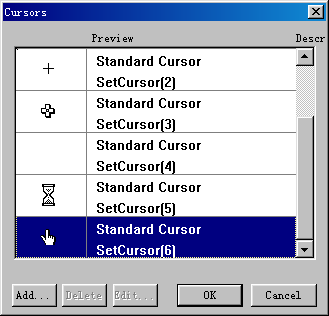 單擊鼠標屬性設置框中“cursors”右邊的按鈕,可以設置鼠標移過按鈕時的形狀。本例選擇手形。