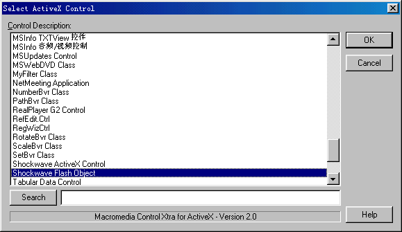 2、新建一個authorware文件,使用“insert”>>“control”>>“activex...”命令,打開選擇activex窗口。找到并選中“shockwave flash object”控件后,單擊“ok”確定。這時可見流程線上出現一個“activex”圖標,將其命名為“activex”。